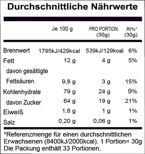 Ingredientes: Azúcar, crema no láctea (jarabe de glucosa, aceite de palma totalmente hidrogenado, almidón modificado (E1450), fosfato dipotásico (E340(ii)), ésteres de ácidos grasos de glicerina (E471), dióxido de silicio (E551)), cacao en polvo, goma guar (E412), sabor a chocolate.