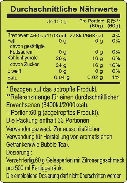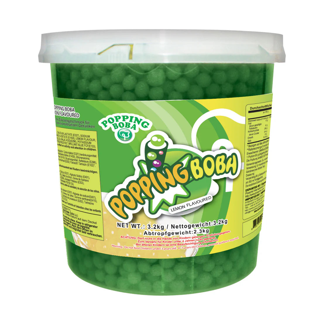 La Popping Boba de Limón es un topping refrescante y divertido, muy popular en Bubble Tea y tés de frutas. Su característica principal es la explosión de sabor cítrico al morder cada perla, brindando una experiencia llena de frescura. Este producto viene listo para usar, solo necesitas añadir una cucharada a tu bebida, smoothie o postre frío. También puede combinarse con gelatina para obtener una textura diferente.