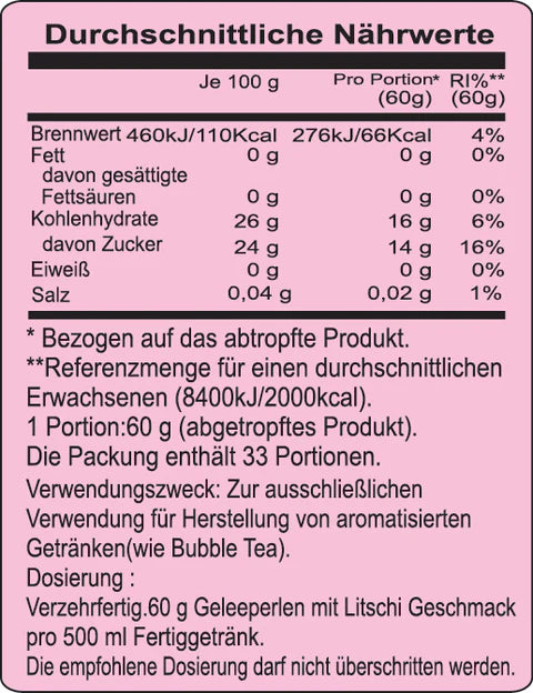 La Popping Boba de Litchi es un topping muy popular en Bubble Tea y tés de frutas. Su característica principal es la explosión de sabor al morder cada perla, lo que crea una experiencia divertida y refrescante. Estas perlas vienen listas para usar: solo agrega una cucharada a tu bebida, smoothie o postre frío. También puedes combinarlas con gelatina para una textura diferente.