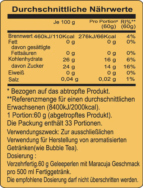 La Popping Boba de Maracuyá (Fruta de la Pasión) es un topping tropical y refrescante, ideal para Bubble Tea y tés de frutas. Cada perla estalla en la boca liberando un sabor dulce y exótico, aportando un toque divertido y veraniego a tus bebidas. Este producto está listo para usar: solo agrega una cucharada a tu bebida, smoothie o postre frío. También puede combinarse con gelatina para obtener una textura diferente.