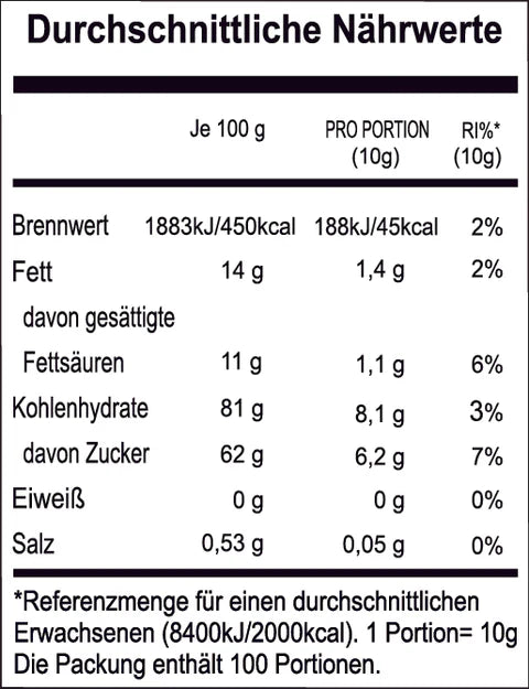Ingredientes: Azúcar, crema no láctea (jarabe de glucosa, aceite de palmiste totalmente hidrogenado, almidón modificado (E1450), fosfato dipotásico (E340(ii)), carragenina (E407), goma de algarrobo (E410), goma xantana (E415), sabor a caramelo, dióxido de silicio (E551), pirofosfato tetrasódico (E450(ii)), colorantes (E110, E102)).